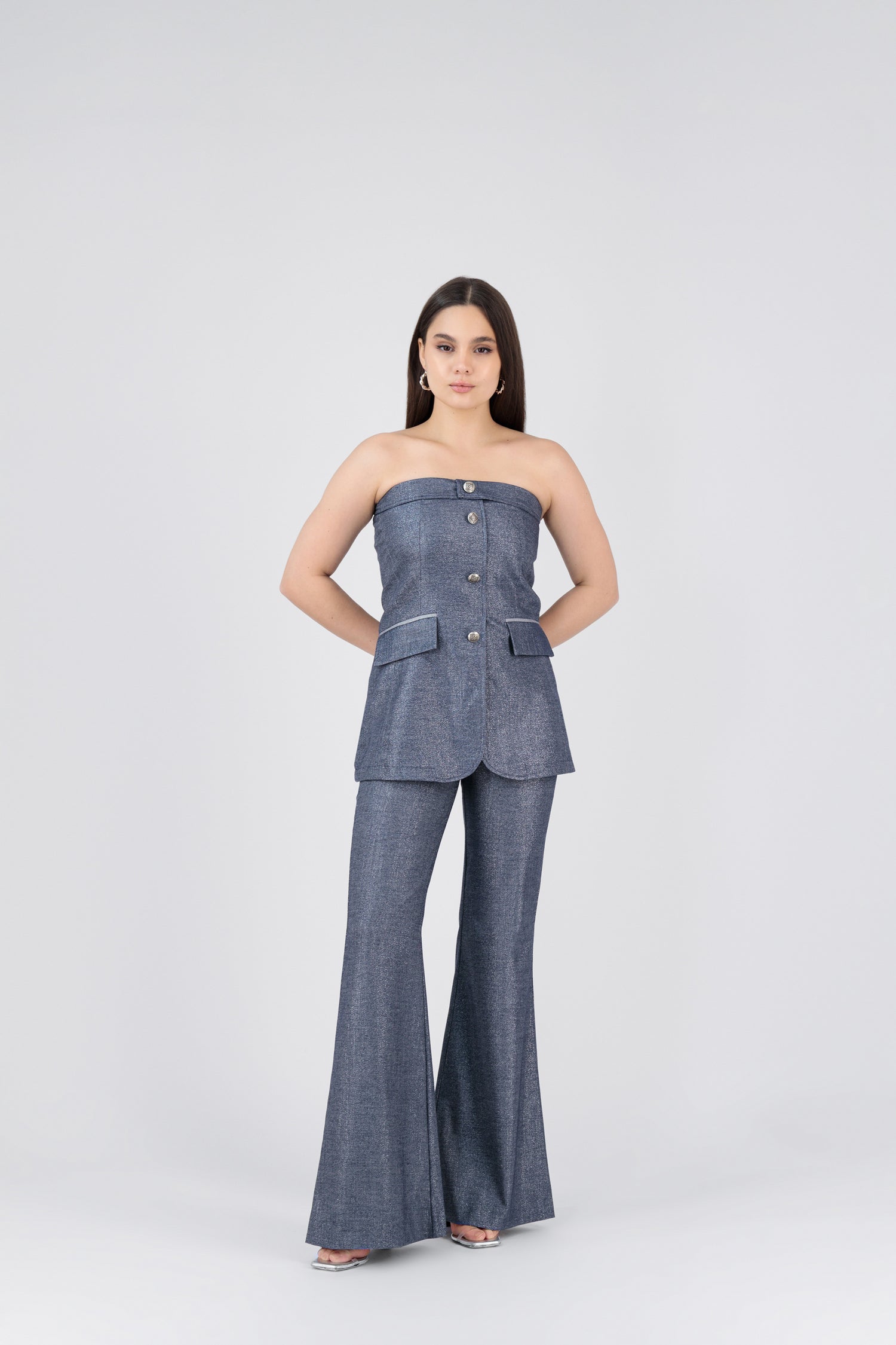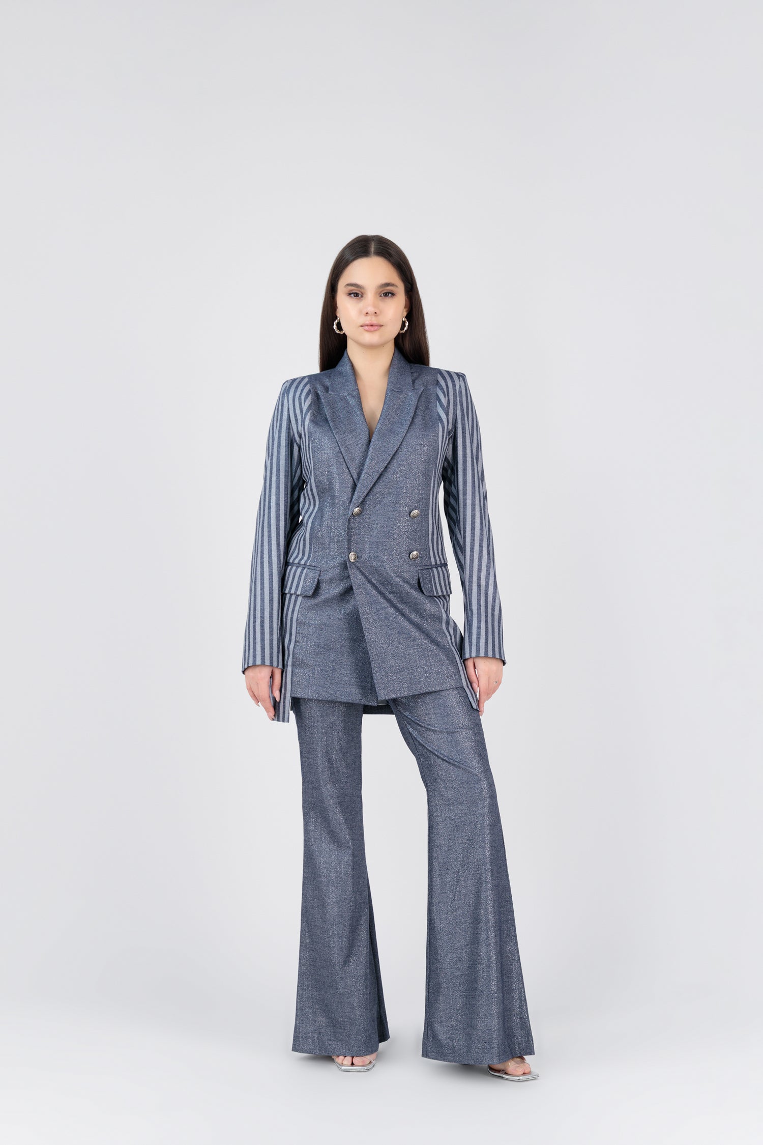Designed for the woman who walks the avenue with quiet confidence, Uptown Stride is a navy suit accented with refined vertical stripes that elongate and flatter. Featuring precise tailoring, subtle shine, and a fluid drape, it’s a go-to piece for power-lunch meetings or after-dark gatherings — embodying modern uptown sophistication.