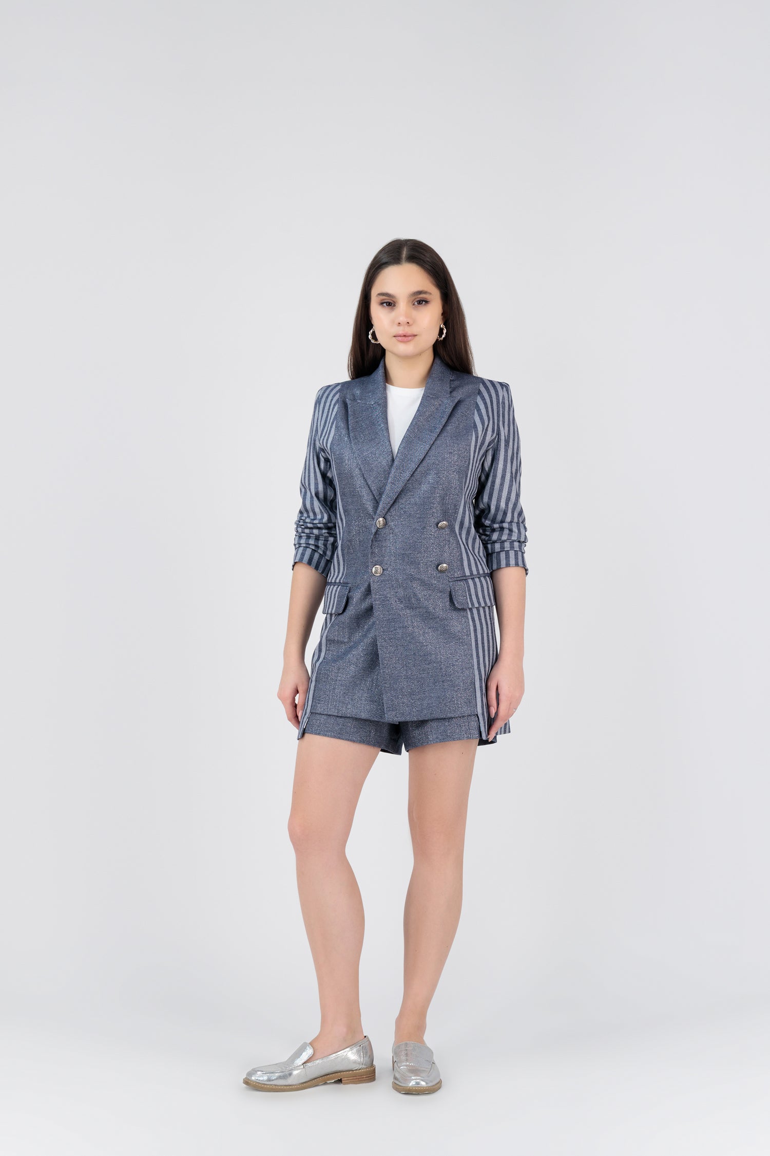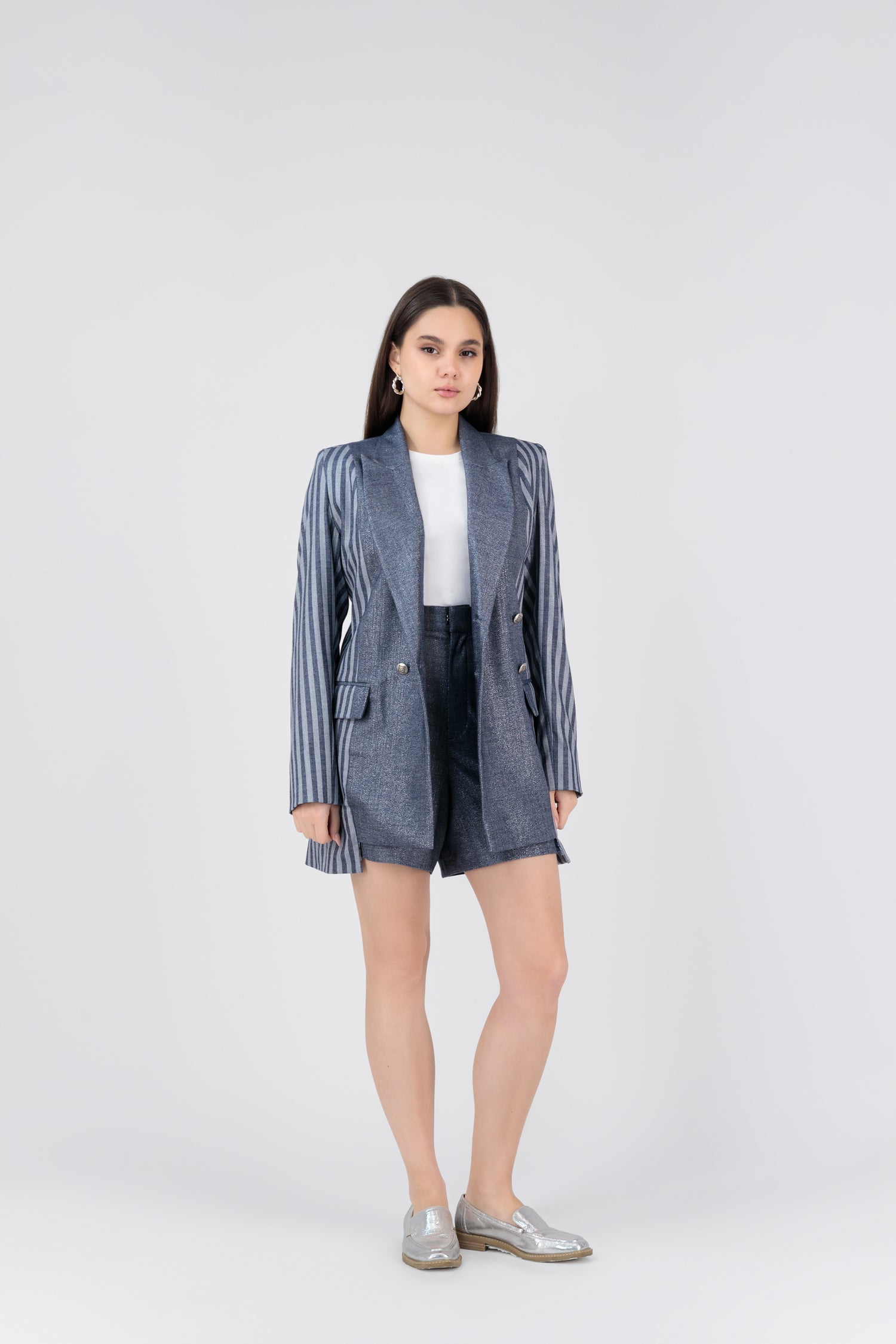 A Shimmery navy-denim story cut for endless versatility. Midnight on Fifth comes as a strapless vest coordinating shorts or flared pants. Its deep midnight tone and sharp, unfussy lines make it the perfect day-to-night staple — polished with sneakers by day, elevated with heels by night.