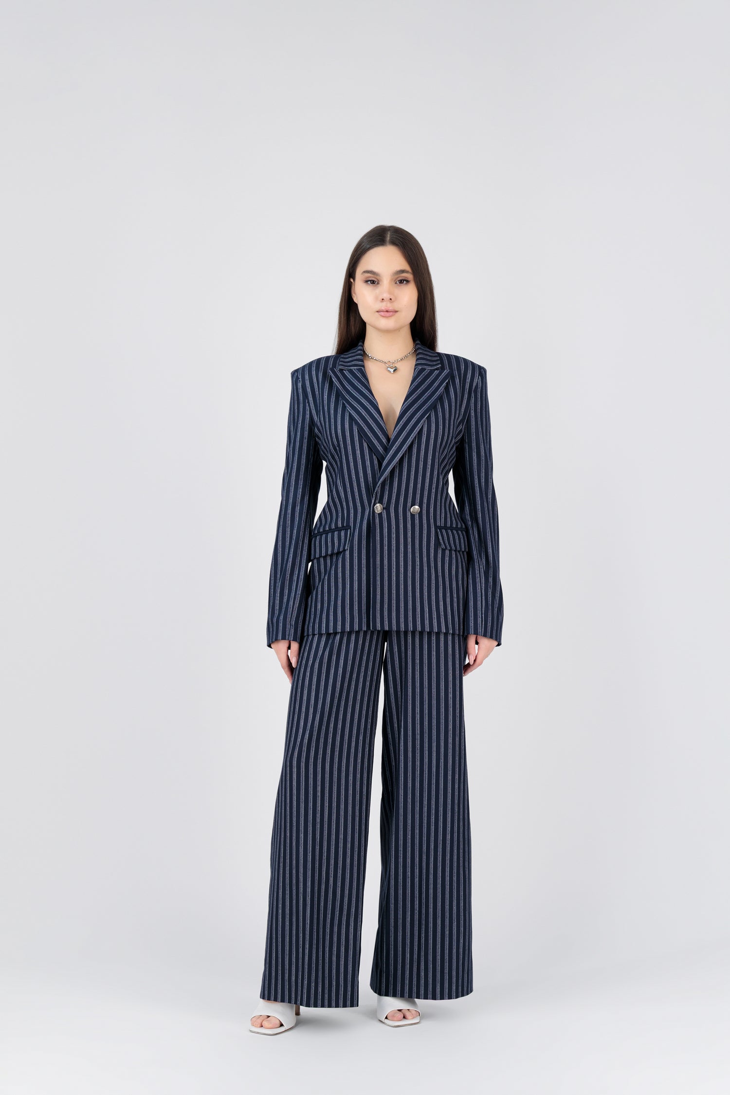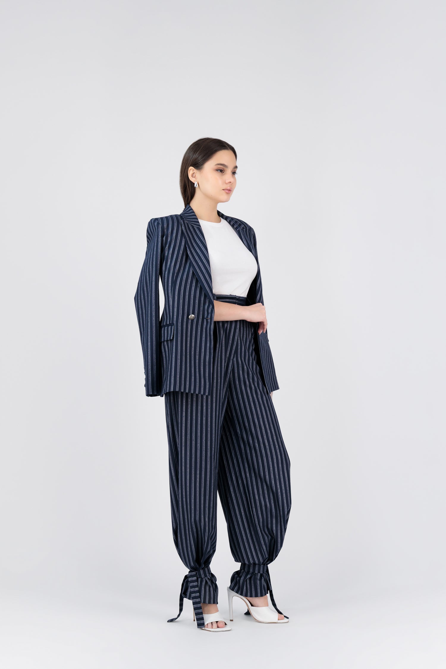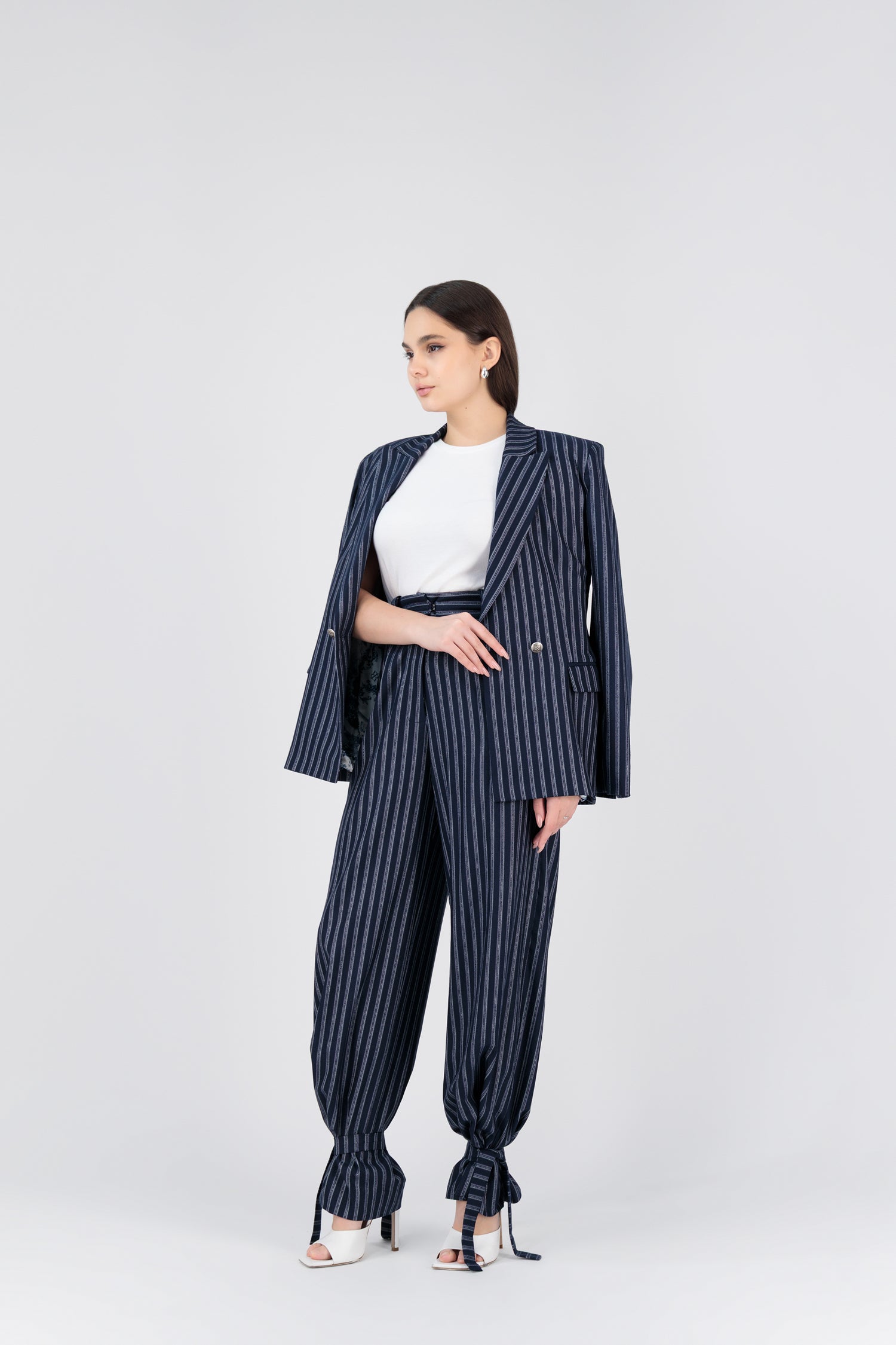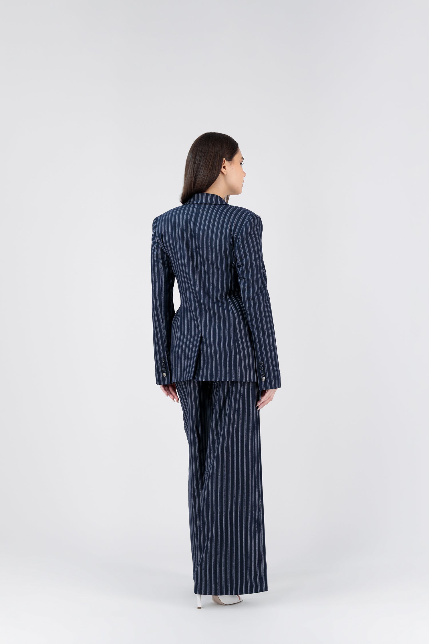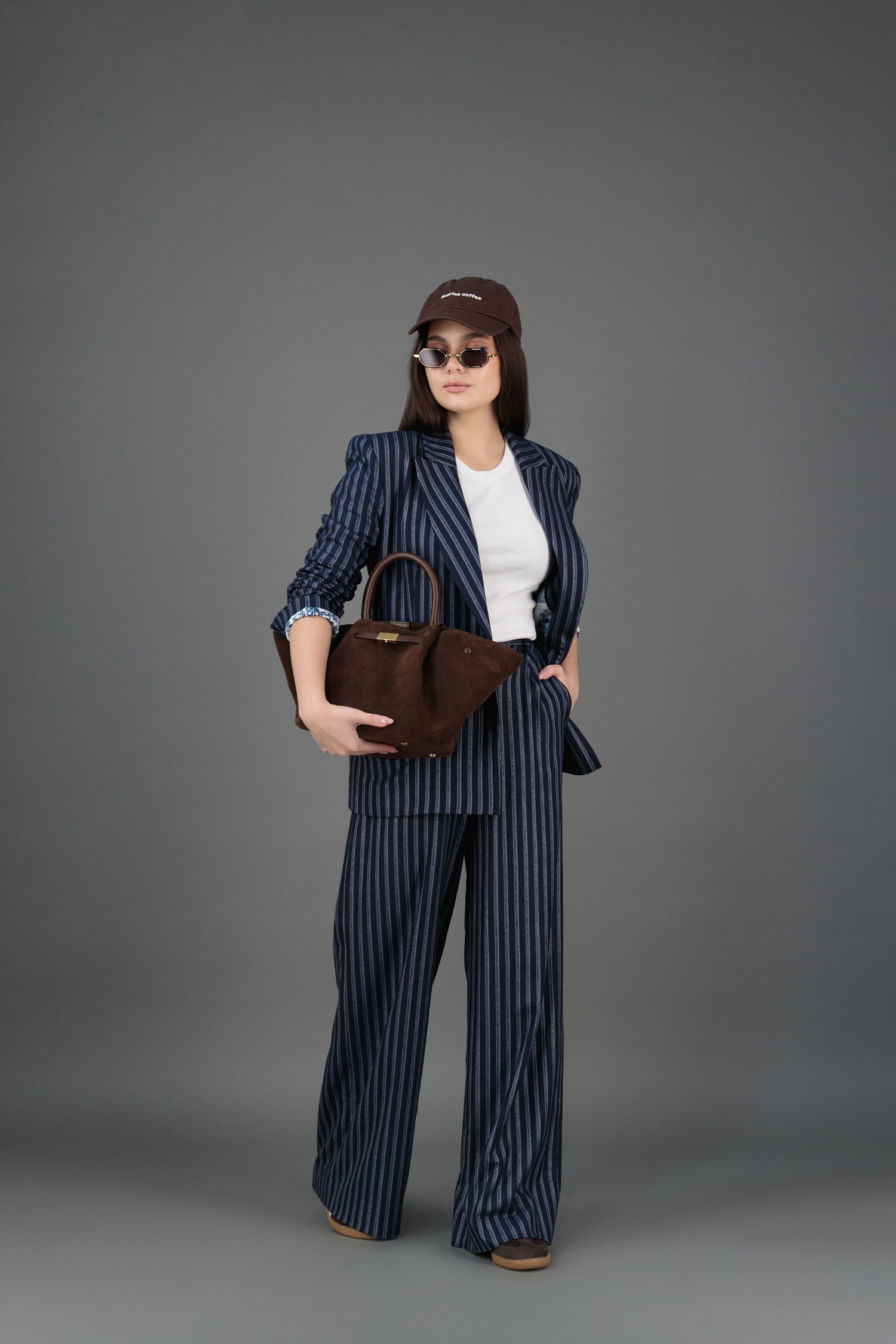 Designed for the woman who walks the avenue with quiet confidence, Uptown Stride is a navy suit accented with refined vertical stripes that elongate and flatter. Featuring precise tailoring, subtle shine, and a fluid drape, it’s a go-to piece for power-lunch meetings or after-dark gatherings — embodying modern uptown sophistication.