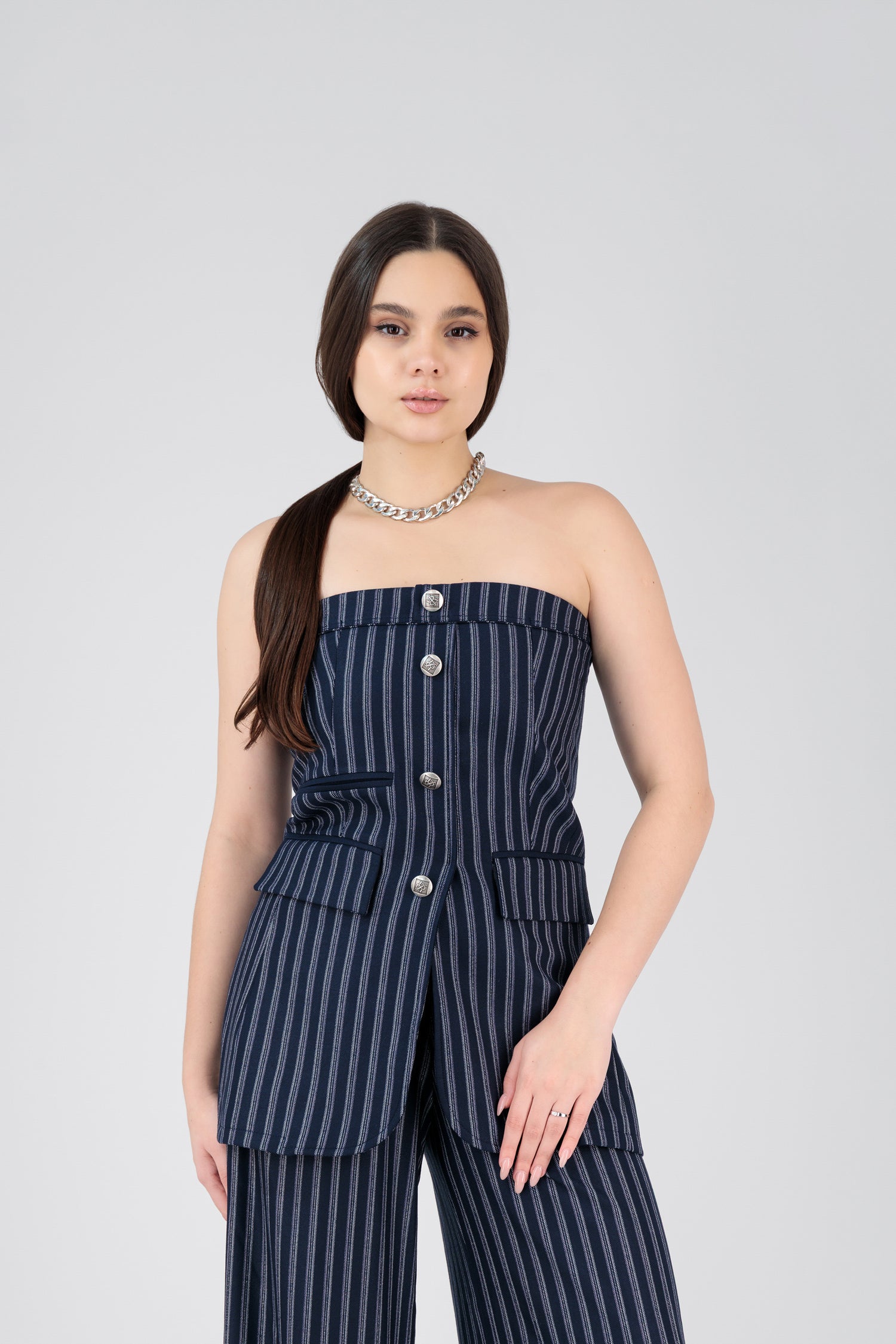 • Strapless Vest with Front Front false pockets and Metal Remy Emblem buttons. Side hidden zip, Elastic Back.