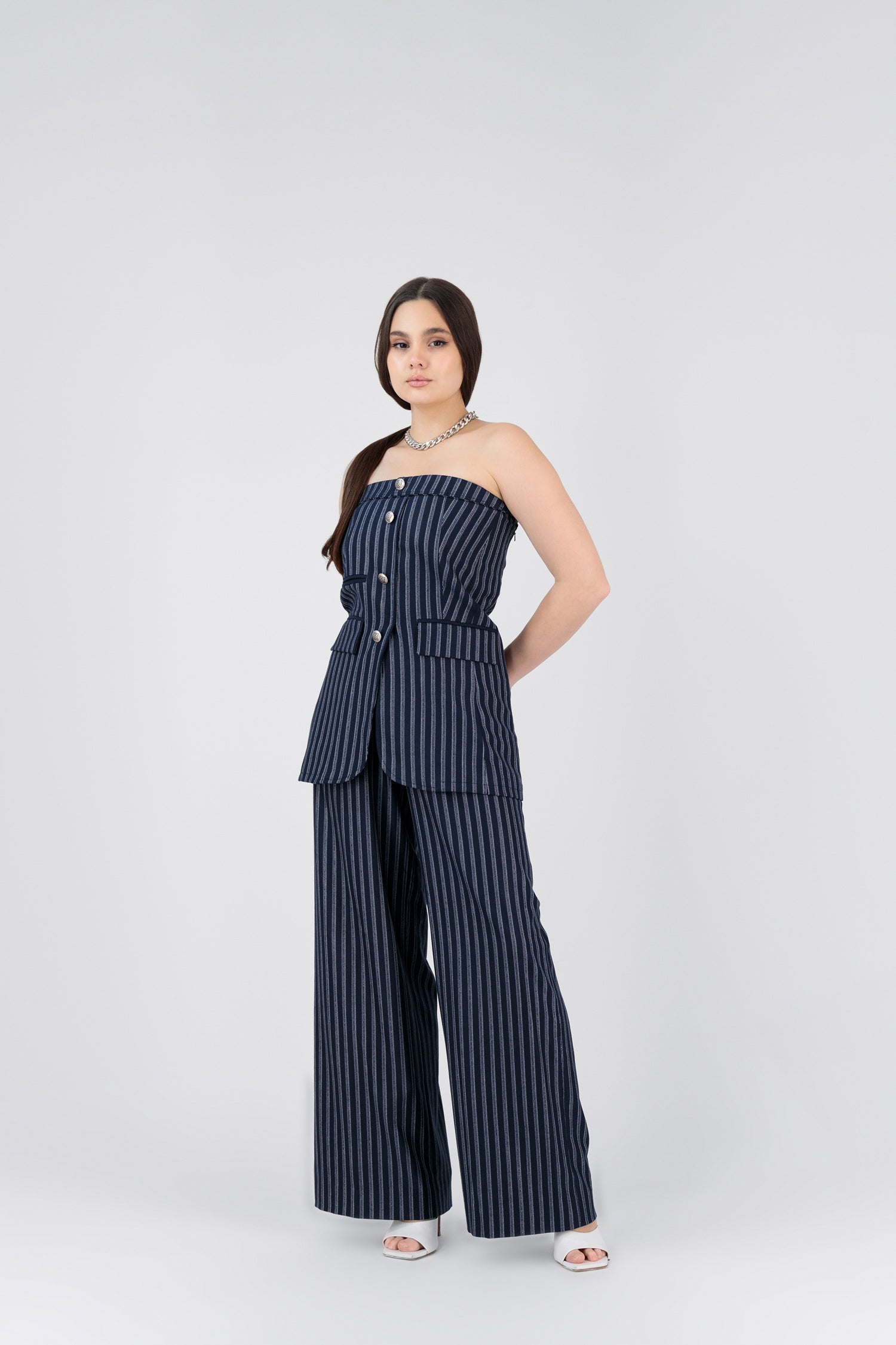 Designed for the woman who walks the avenue with quiet confidence, Uptown Stride is a navy suit accented with refined vertical stripes that elongate and flatter. Featuring precise tailoring, subtle shine, and a fluid drape, it’s a go-to piece for power-lunch meetings or after-dark gatherings — embodying modern uptown sophistication.